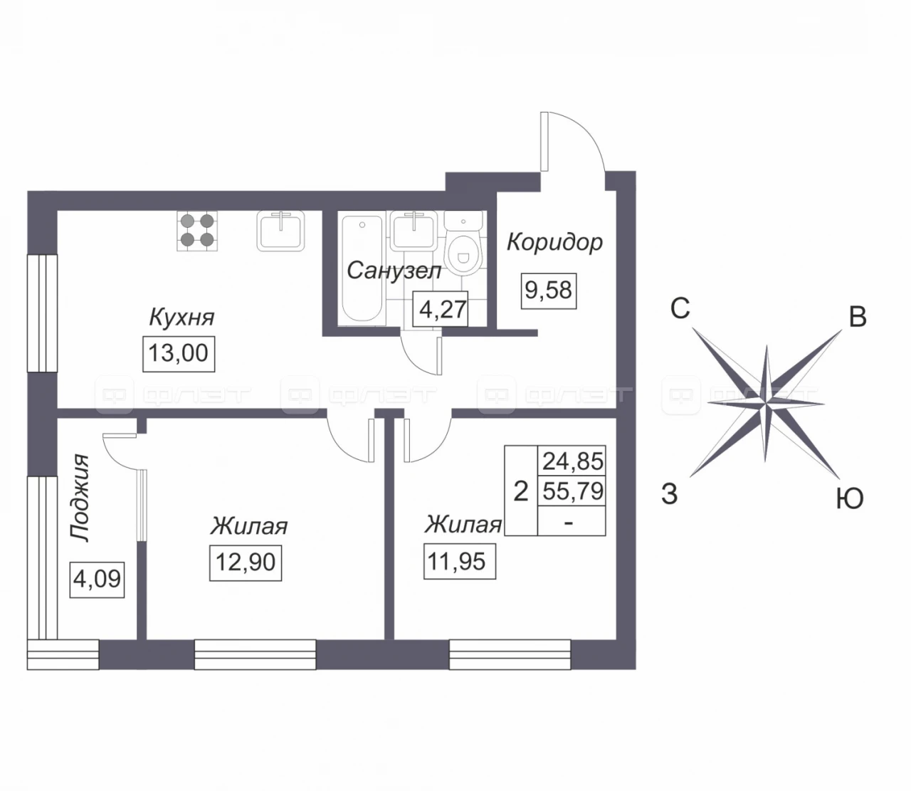 - 55.79/24.85/13 м²